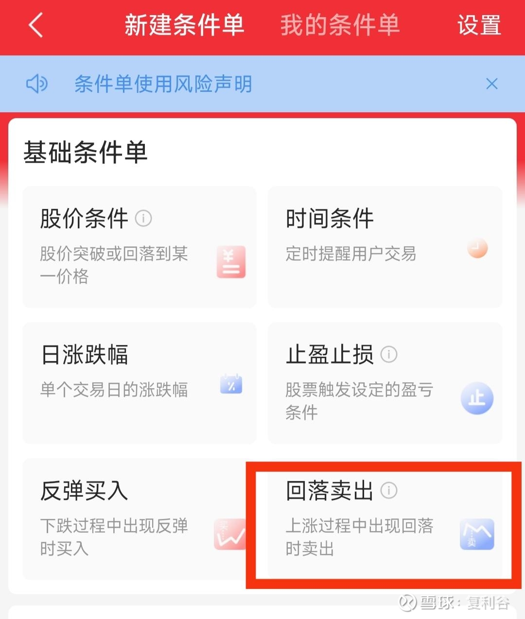 在页面中找到回“条件单”,选择回落卖出