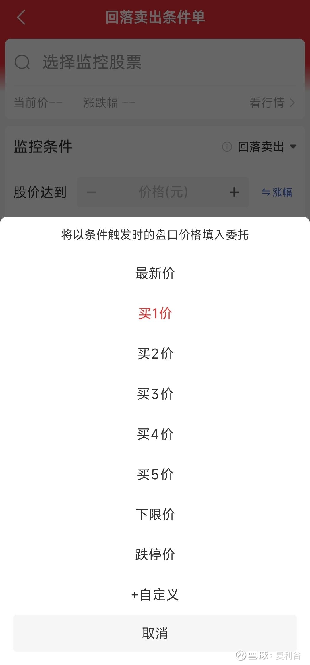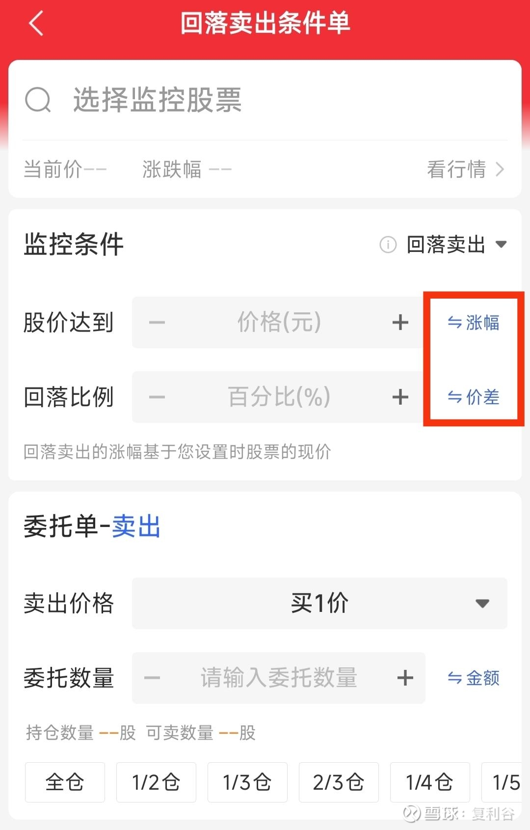 这里可以选择达到涨幅后的回落比例(回落价差),或者达到某一个预计价格后的回落比例(回落价差)