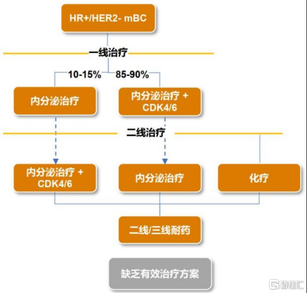 结合全球HR+/HER2-乳腺癌治疗指南路径,一线治疗标准CDK4/6抑制剂+内分泌治疗把无进展生存期(mPFS)从约14-16个月提升到约26-33个月;但一旦CDK4/6抑制剂进展后,后续的内分泌治疗的疗效都不佳,二线及后线患者存在巨大未满足临床需求。