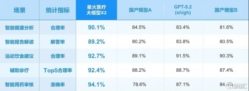 在医疗专业度层面,星火医疗核心算法平台的各项关键指标均实现行业领跑,在智能健康分析、报告解读、辅助诊疗等核心任务上,表现显著优于DeepSeek V3.2、GPT-5.2等国内外主流模型,能够更好地适配医疗场景的实际需求。