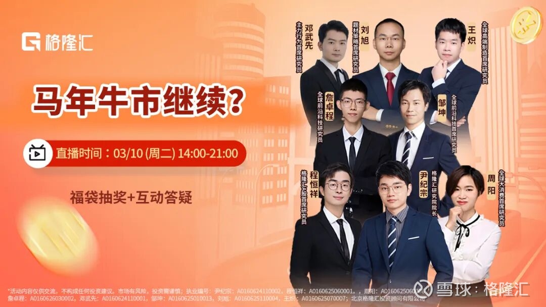 另外,2026年3月10日(下周二),格隆汇研究院院长将带领格隆汇各行业首席研究员为大家带来大场直播活动——“马年牛市继续?”,精彩内容不容错过!