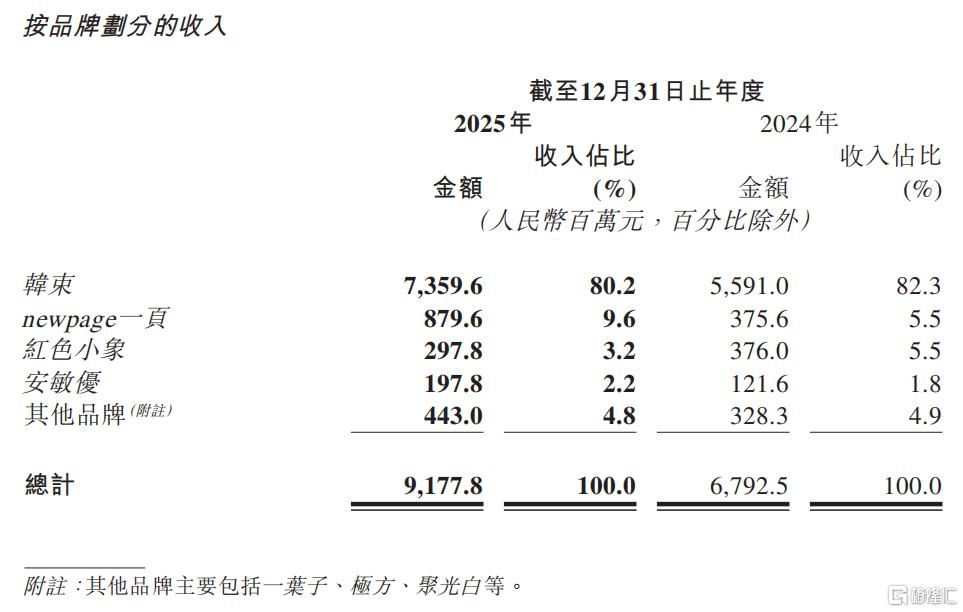 2025年财报中,作为集团压舱石,韩束2025年收入73.60亿元(+31.6%),占总营收80.2%,线上GMV位列国货美妆第一。同样亮眼的还有newpage一页的8.8亿元,同比增长134.2%。这个2022年才推出的婴童功效护肤品牌,正在成为上美股份第二增长曲线的核心支点。