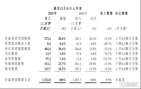 新零售业务同样异军突起。2025年公司创新开展新零售业务,围绕业主日常生活刚需场景深耕细作,全年实现收入9720万元,同比激增723.7%,成为社区增值服务中增长最快的细分板块。
