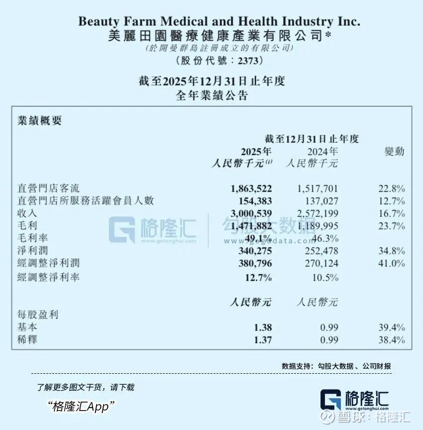 然而美丽田园走出了不同的曲线。过去的2025年,公司收入增长16.7%,经调净利润却以41.0%的速度狂奔。2023年公司毛利率45.6%,2025年跃升至49.1%。