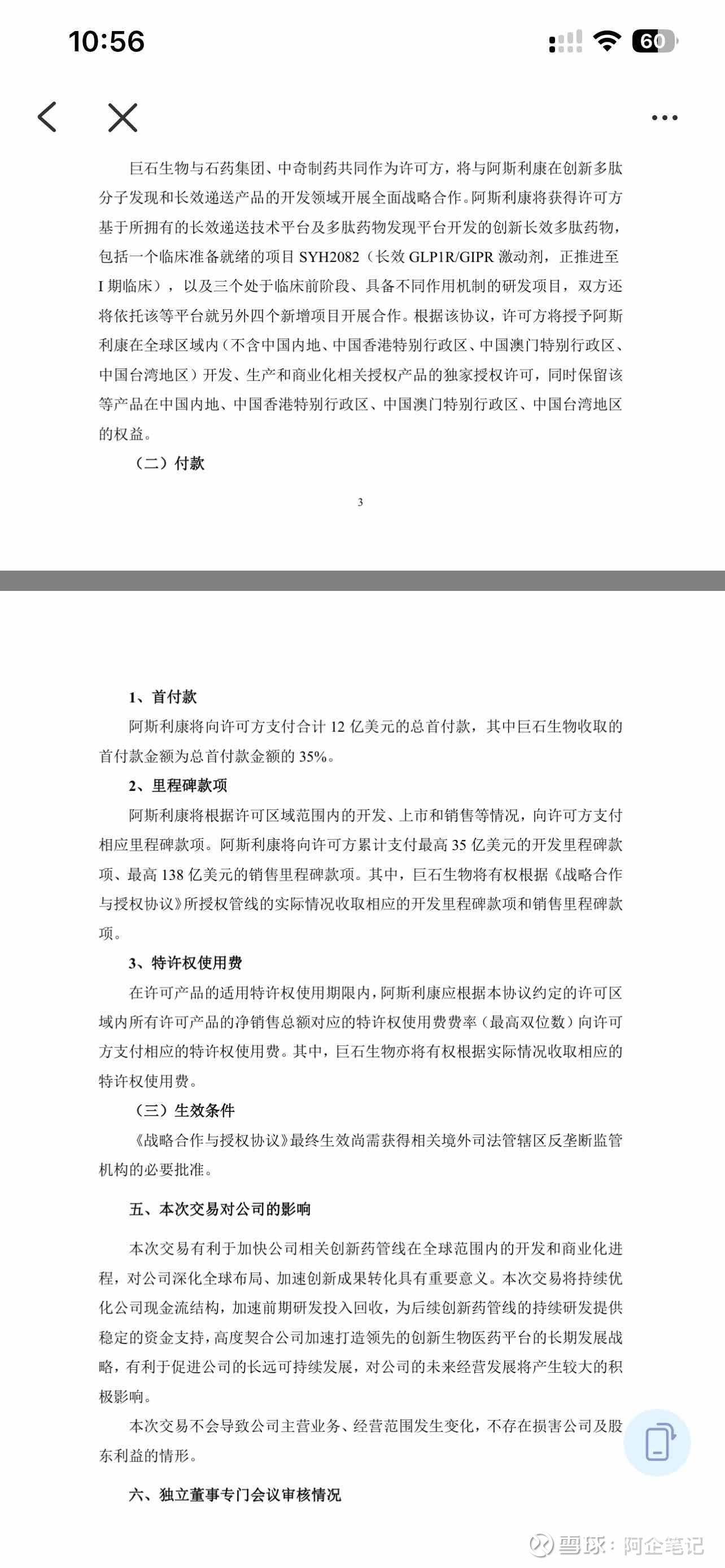 $石药集团(01093)$ 股市就是这样,股价跌了就各种找原因,没有利空只有利好的情况下翻箱倒柜也要强行找出来了一个。。比如昨天有人抠字眼说预付款和首付款不一样,笑死我了,这只是两种表达一个意思而已,就是一次性给你的一笔签约款,石药港股公告一直就是用这个词。。