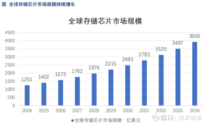 据Market.us预测,在人工智能的驱动下,预计到2034年,全球存储芯片市场规模将从2024年的1251亿美元增至3920亿美元,复合年增长率为12.1%。