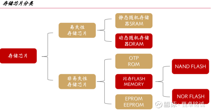 按断电后是否保留数据,存储芯片主要分为两类,易失性存储芯片和非易失性存储芯片,二者代表产品分别为DRAM和NAND Flash,即内存和闪存/硬盘。
