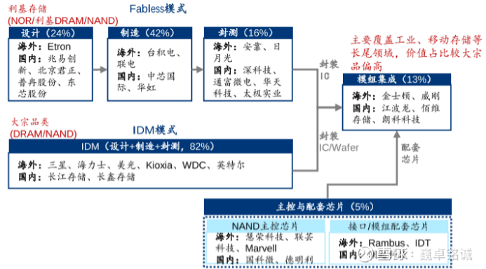 按是否全产业链生产,存储芯片主要有两种生产模式,一个是集设计、制造和封测一体化的IDM模式,一个是设计厂商将制造和封测环节委托给晶圆代工厂或封测企业的Fabless模式。
