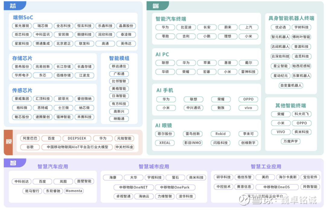 整体来看,芯片层包括端侧SoC、存储芯片和传感芯片在内的核心硬件;智能模组是核心硬件的集成与优化解决方案;模型层汇聚了头部企业的大模型及行业解决方案;终端应用层面,AI手机、AIPC、智能汽车、AI眼镜以及具身智能机器人等设备正加速落地。
