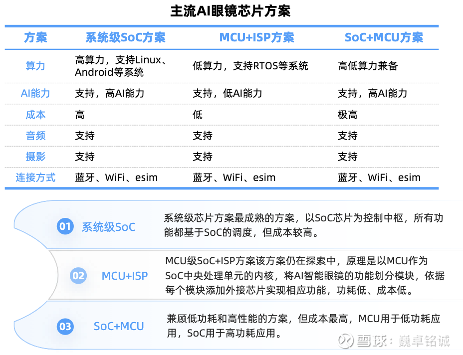 目前AI眼镜搭载的SoC芯片主要有三种架构方案:系统级SoC、MCU级SoC+ISP、SoC+MCU。其中,SoC+MCU方案具有高低算力兼备、支持高AI能力的优势,应用潜力较大。