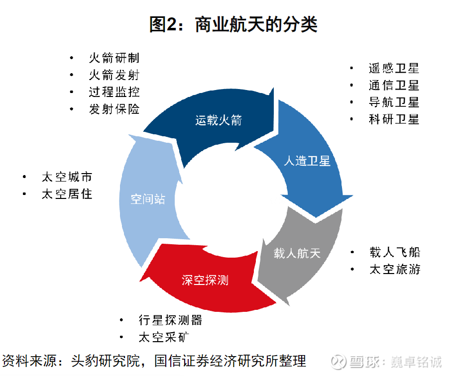 商业航天按功能可分为:运载火箭、人造卫星、载人航天、深空探测及空间站等领域;按离地距离则可划分为近地空间商业航天、宇宙空间商业航天以及深空商业航天等多个方向。