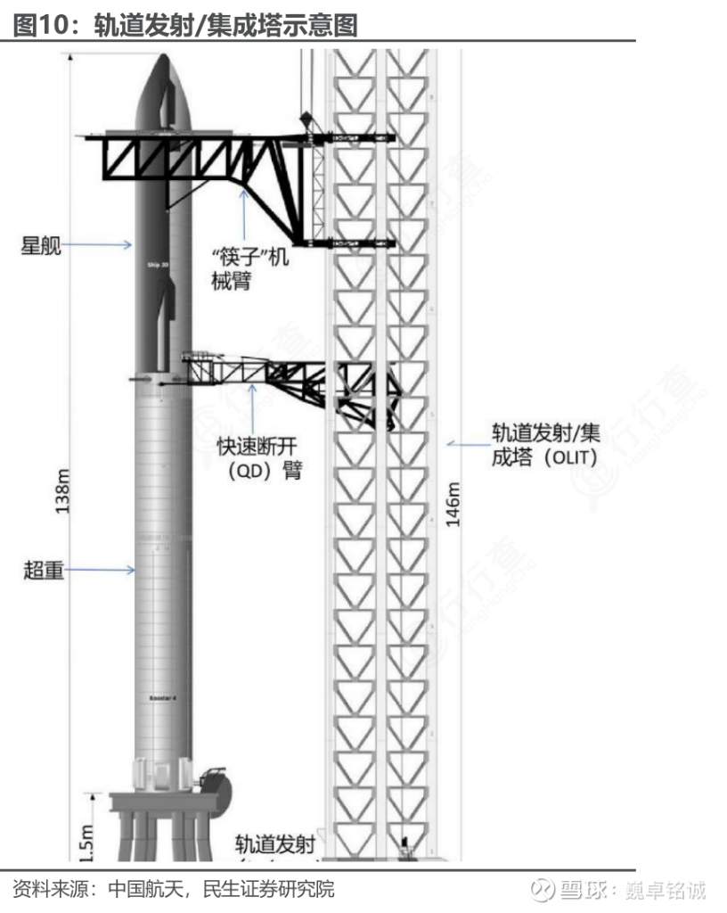 其中,超重助推级通过发射塔上的巨型机械臂,以“筷子夹火箭”的方式捕获回收,摒弃了传统的着陆腿设计。这种“筷子”机械臂采用双叉臂结构,可沿发射塔架上下移动,并能围绕中间纵轴旋转,具备多种功能,包括对超重助推级和星舰飞船进行升降、总装等操作。