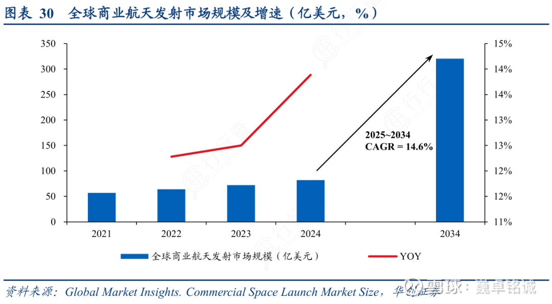商业发射市场目前正处于快速发展阶段,技术进步与成本降低推动市场规模持续扩大。根据Global Market Insights的数据,全球商业航天发射市场规模在2024年接近90亿美元,并预计到2034年将大幅增长至超过310亿美元,复合年增长率(CAGR)达14.6%。