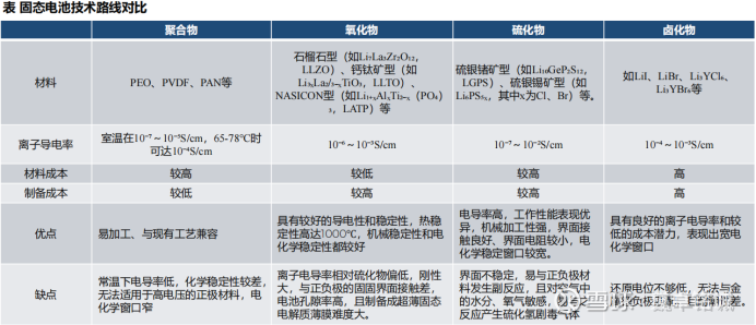 按电解质划分,固态电池分为4条路线,这在前面我们就说到了,包括聚合物、氧化物、硫化物、卤化物,4条路线各有各的优缺点。
