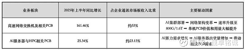 2025年上半年营收84.94亿元,同比+56.59%,其中企业通讯市场板收入65.32亿元,同比大幅增长70.63%。AI服务器与HPC相关PCB同比增长25.34%,占该板块收入的23.13%。高速网络交换机及相关PCB同比暴增161.46%,占该板块收入的53%,是增长最快的细分领域。