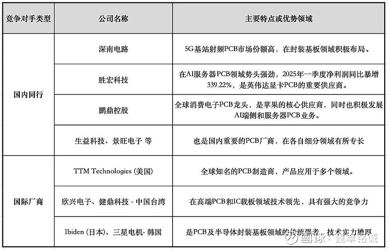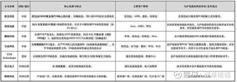 AI服务器和HPC用PCB技术门槛高,市场竞争激烈,沪电股份的对手主要来自国内和海外/中国台湾地区,参考下图: