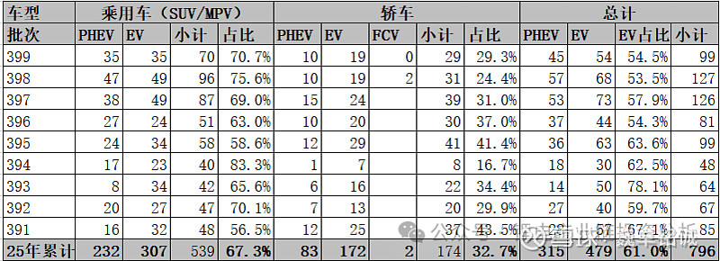 399批公告公示新能源乘用车共有25家企业53款车型99款公告。其中轿车29款和SUV、MPV等乘用车70款。按动力分:EV54款,PHEV 45款(增程14款),EV车型占比54.5%。