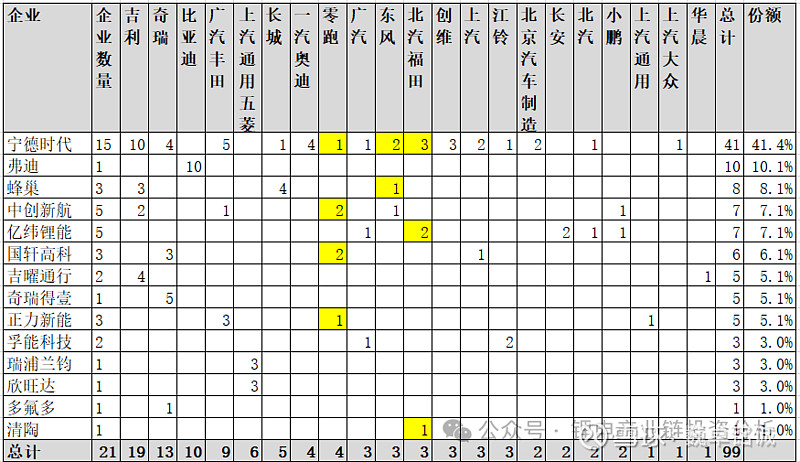 孚能科技配套车型包括江铃羿驰05S、广汽AION UT,全部是磷酸铁锂电池。瑞浦兰钧全部为上汽通用五菱配套,包括宏光MINIEV、五菱缤果S、享境S9。欣旺达配套车型包括上汽通用五菱享境S9、五菱缤果。多氟多配套车型只有奇瑞QQ冰淇淋。清陶与宁德时代共同配套北汽福田风景 i9。今年以来的配套情况:今年以来共有22家电池企业参与配套,配套数量较多的企业有宁德时代、弗迪、国轩高科、中创新航、欣旺达、蜂巢、亿纬锂能、正力新能、瑞浦兰钧、吉曜通行等。02