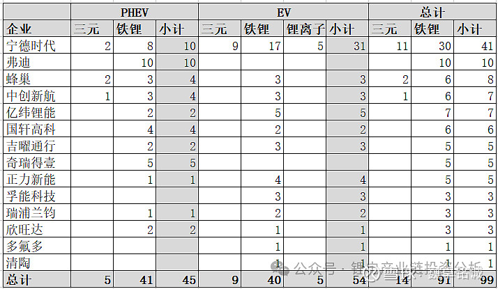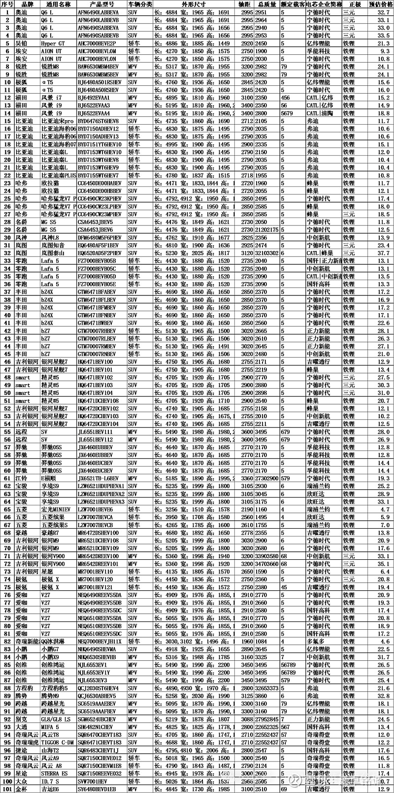 动力及材料结构宁德时代配套PHEV车型只有10款,31款是EV车型。PHEV车型中,只有2款采用三元电池,车型为东风岚图泰山、吉利银河V900,均为大型车,配套的电池比较大,岚图泰山为65.1kWh,银河V900为50kWh。EV的三元车型为奥迪Q6 L、东风岚图知音、吉利精灵#5、极氪 X,也是大中型车。小型车很难配三元电池了。另外5款未说明电池材料,车型为广汽丰田bZ4X,车型比原车型要重一些,推测铁锂的可能性比较大,算在铁锂车型了。