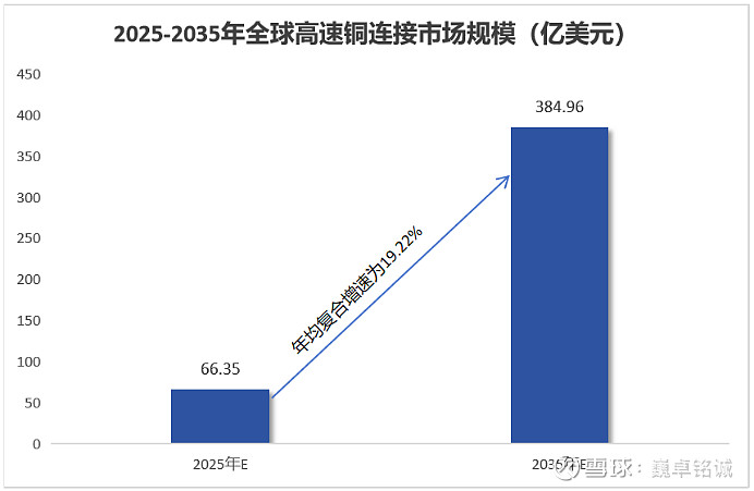据行业预测,2025年-2035年,全球高速铜连接市场规模有望从66.35亿美元增长至384.96亿美元,年均复合增速高达19.22%,前途一片光明。