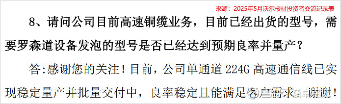 到了2024年,公司的高速铜缆单通道传输速度已经可以做到224G/s,放到当下也是业内单通道通信线的最高传输速度,已实现稳定量产和批量交付。