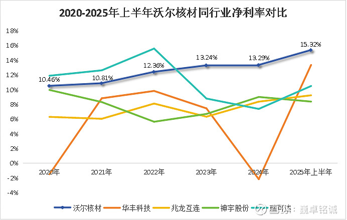 2020年-2025年上半年,沃尔核材的毛利率始终在30%以上,常年领先兆龙互联、神宇股份等同行;同期净利率也连年攀升,在2025年上半年达到15.32%,为5家公司中最高。