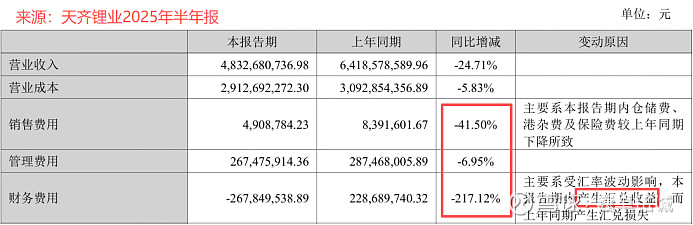 2025年上半年,天齐锂业的销售费用、管理费用、财务费用同比均有所下降。其中,降幅最大的当属财务费用,主要来源于汇率波动产生了4.87亿外汇收益,不仅抹平了原本的财务费用缺口,还带动整体费用的下降。