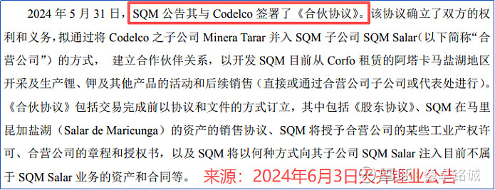 2024年5月,SQM公告与智利国家铜业公司签署了《合作协议》,双方将成立一家合营公司共同开发阿塔卡马盐湖地区的资源。