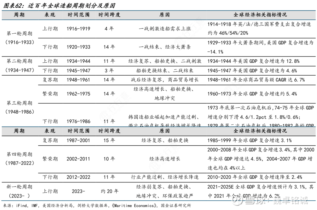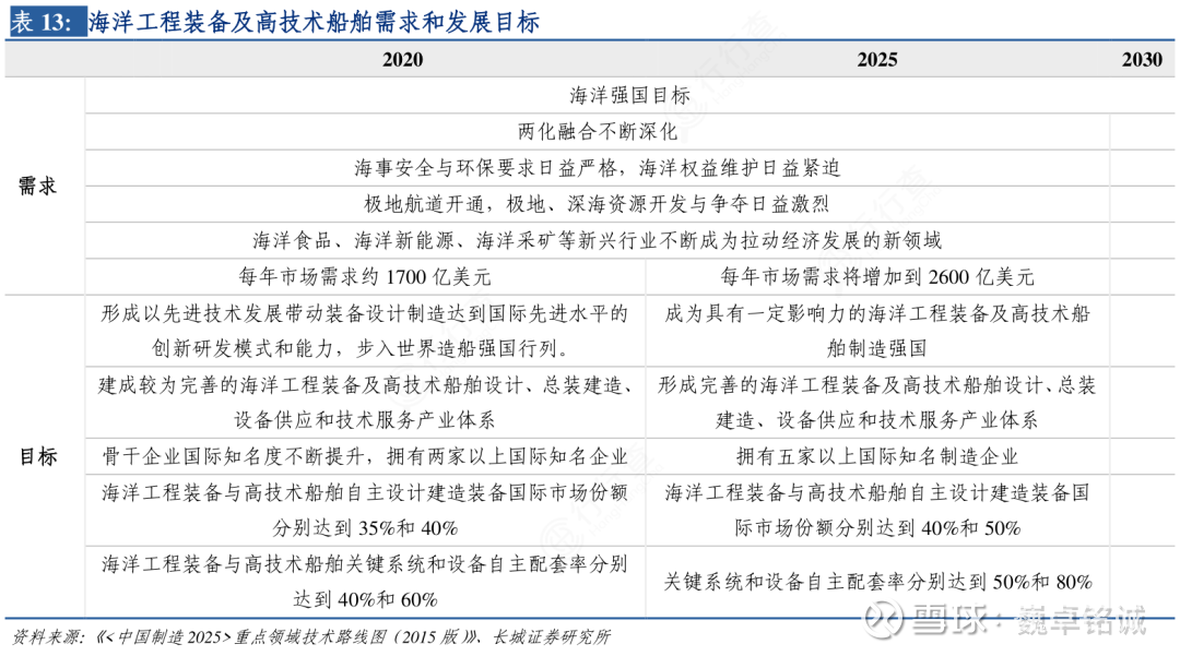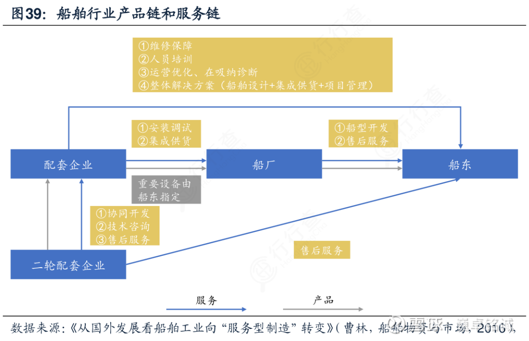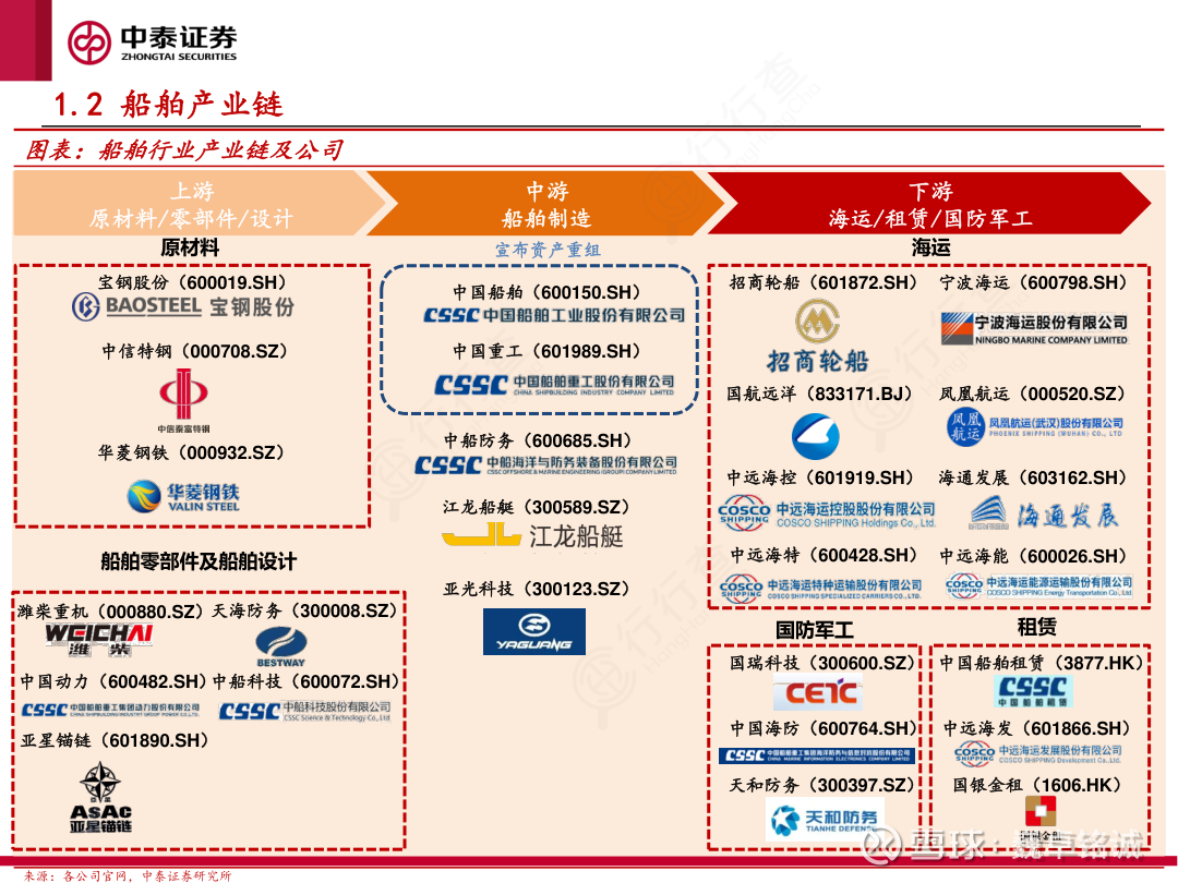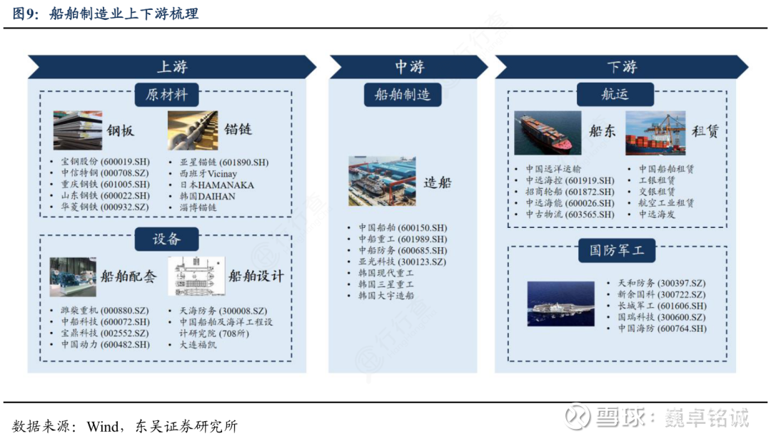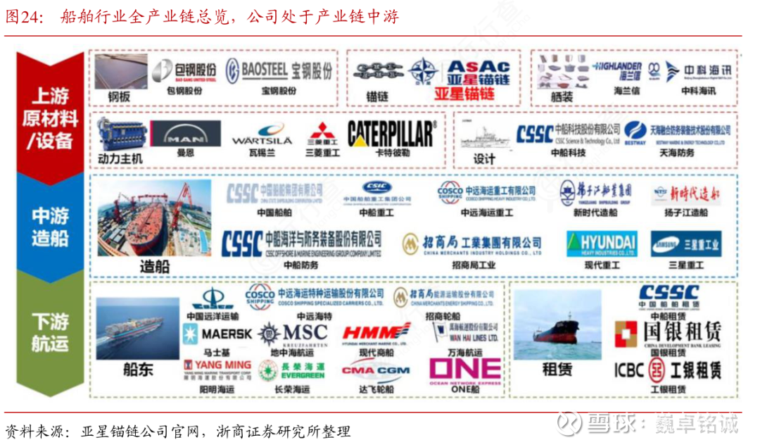 原材料以钢材为主,同时涵盖船用涂料等辅助材料;船舶设计环节主导船舶性能与结构规划,中国船舶集团旗下的第701、708、719研究所是该领域代核心单位;配套设备是成本核心,占比达40%,包括动力系统、导航设备等,中国动力提供发动机等动力装备,亚星锚链主导全球锚链市场,海兰信的水下声呐系统市占率超70%,这些企业共同构成船舶制造的基础支撑。