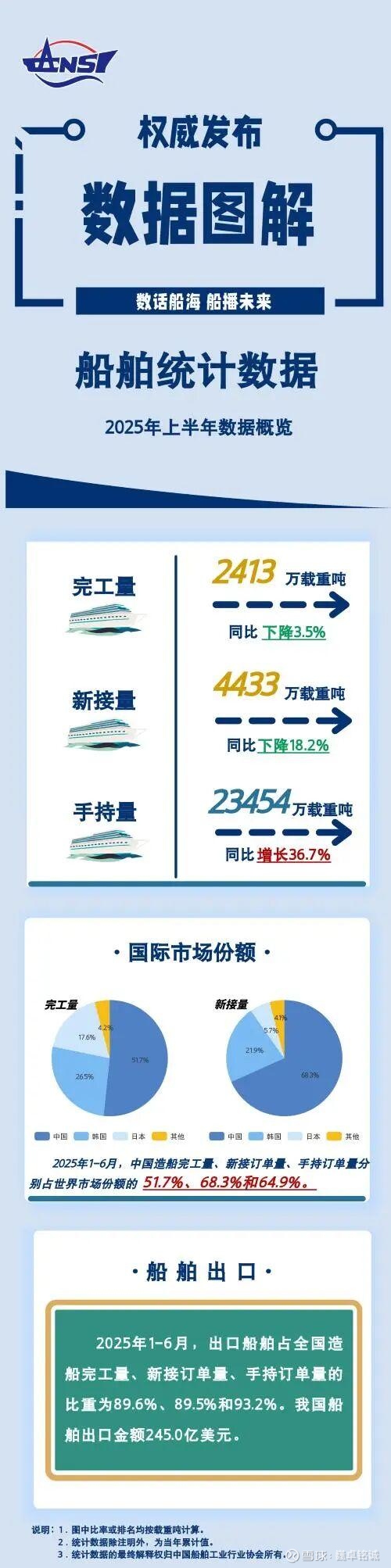 根据中国船舶工业行业协会发布的数据,2025年1-6月,我国造船完工量2,413万载重吨,同比下降3.5%;新接订单量4,433万载重吨,同比下降18.2%。截至6月底,我国造船手持订单量23454万载重吨,同比增长36.7%。1-6月,我国造船三大指标以载重吨计分别占世界总量的51.7%、68.3%和64.9%,以修正总吨计分别占47.2%,64.0%和57.6%。