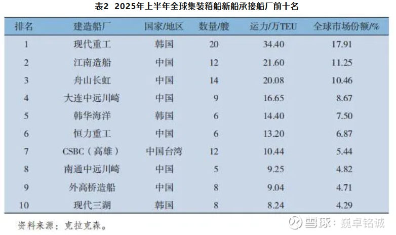 2025年上半年,承接新造集装箱船订单的船厂多达38家,前十头部船厂的订单额占全球订单总额的81.92%。从具体订单看,中国船厂表现优异,江南造船共获得12艘订单,总运力达21.60万TEU;舟山长虹造船厂获得14艘订单,总运力达20.08万TEU。韩国船厂方面,现代重工以20艘、34.40万TEU的接单成绩,成为上半年全球集装箱船新船市场最大的赢家。