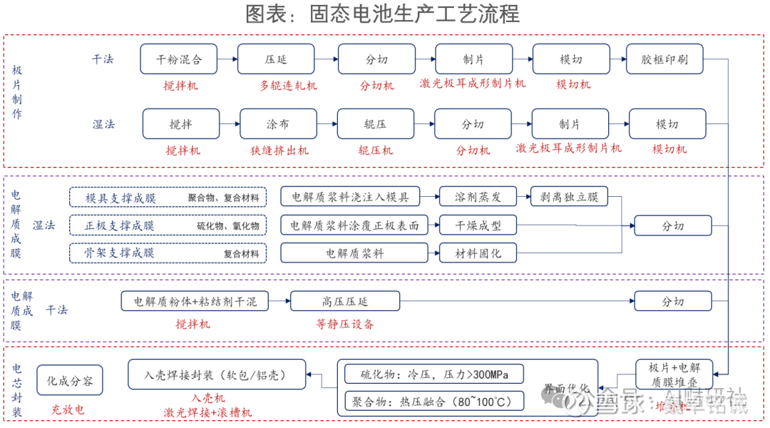 前段是变化最大的环节。传统湿法核心工序包括混浆、涂布、烘干、辊压,而固态路线下将形成全新的组合: