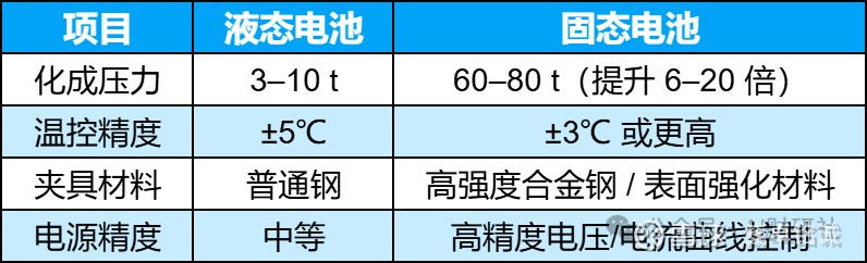 液态电池的化成拘束压力仅需 3–10 t,而固态电池需要 60–80 t 的高压激活。