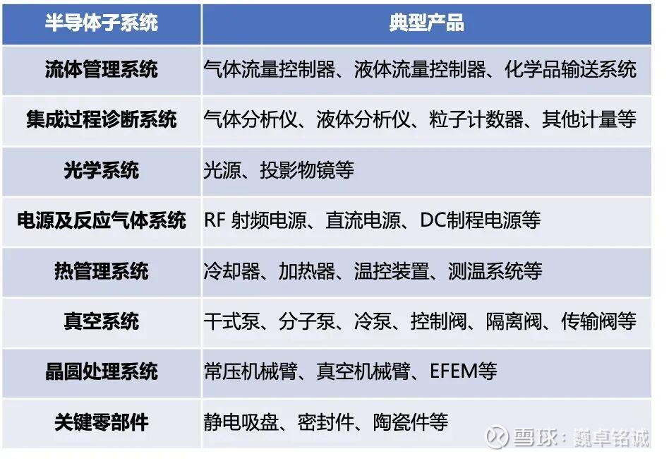按流程分类的半导体零部件子系统及其典型产品: