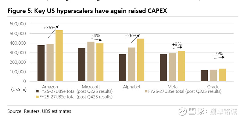 美国电力短缺问题持续发酵,AI 驱动的基础设施建设推动超大规模企业( hyperscalers)资本开支大幅增长。2026 年美国超大规模企业资本开支同比增速预计从 37% 飙升至 59%,2025-2027 年累计资本开支较 2025 年第三季度预期上调 16%,电力设备需求呈现结构性增长态势。