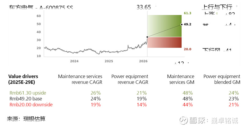 东方电气 - A:目标市盈率从 22 倍上调至 28 倍,目标价从 37.9 元上调 30% 至 49.2 元,潜在涨幅 54%;