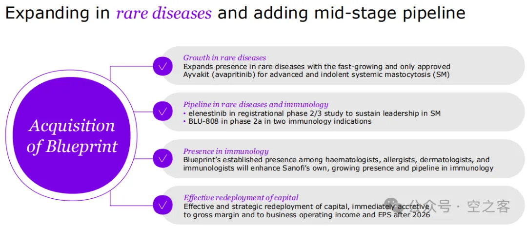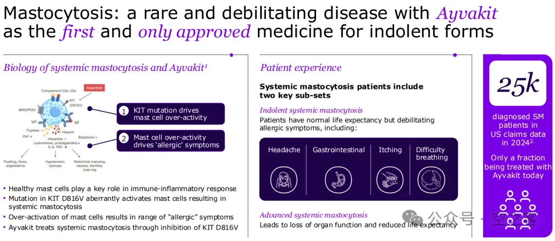 SNY叫嚷了好久的“all-in Immunology”,于是花$9.5b收购Blueprint获得了一众cKIT抑制剂资产,其中Avapritinib已获批用于治疗肥大细胞增多症、年销售额$600m左右已算尚佳表现(25Q2 $175m)、毕竟这病在美国也就2.5万人,如此夸张的价码只能理解为冲着尚在早期的野生型KIT抑制剂BLU-808去,问题是看上去最靠谱的适应症也就是荨麻疹了,早早获批的Omalizumab在这适应症上的销售额能有$1b就不错了,实在没想明白如何赚回票价来。