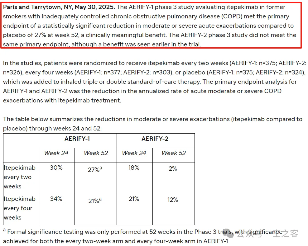 继上个季度OX40L单抗Amlitelimab在哮喘折戟,本季度另一个被寄予厚望的自免靶点IL-33又掉了链子,Itepekimab在治疗COPD的两项三期临床AERIFY-1&2试验中,前者达到主要临床终点对中重度恶化有显著改善,而后者则未能达到。