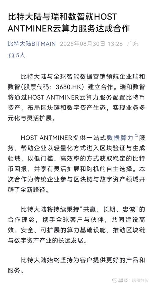8月30日 ,比特大陆在企业官网和企业官方微信公众号发布重要消息:宣布与香港上市公司瑞和数智达成合作,通过 HOST ANTMINER云算力服务助力瑞和数智配置比特币资产,布局区块链和数字资产生态,实现业务多元化与灵活扩展。