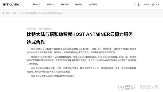 比特大陆与瑞和数智就HOST ANTMINER云算力服务达成合作