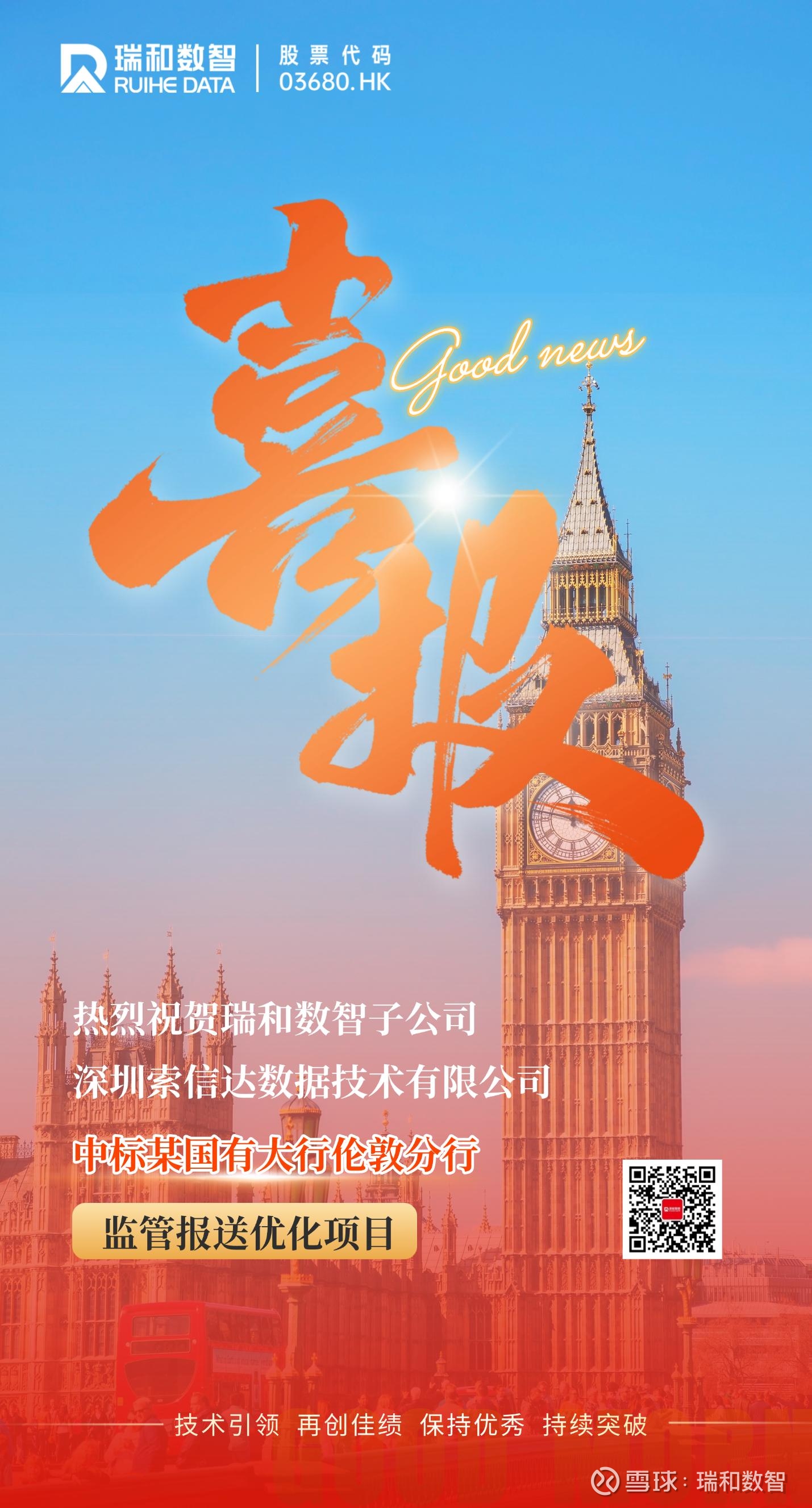 金秋十月传捷报。近日,瑞和数智(03680.HK)旗下子公司深圳索信达数据技术有限公司成功中标某国有大行伦敦分行监管报送优化项目。该项目旨在全面提升伦敦分行监管报送的自动化水平与数据治理能力,确保其符合英国本地金融监管要求,为海外业务合规发展提供有力支撑。