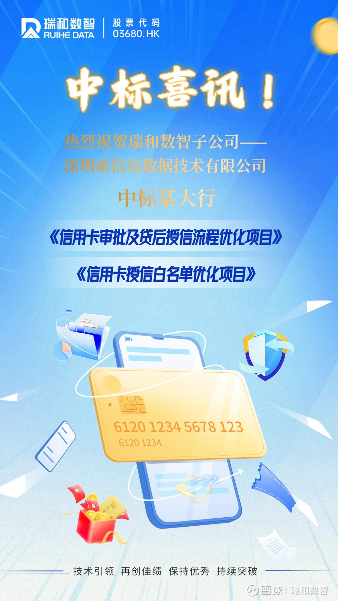 近日,瑞和数智(03680.HK)旗下子公司深圳索信达数据技术有限公司连续中标某大行“信用卡审批及贷后授信流程优化”与“信用卡授信白名单优化”项目。此次中标的两个项目,均围绕该大行信用卡审批与风险管理的数字化、合规化需求展开,双方将携手推动该行信用卡业务审批效率与风险控制水平的双重提升。