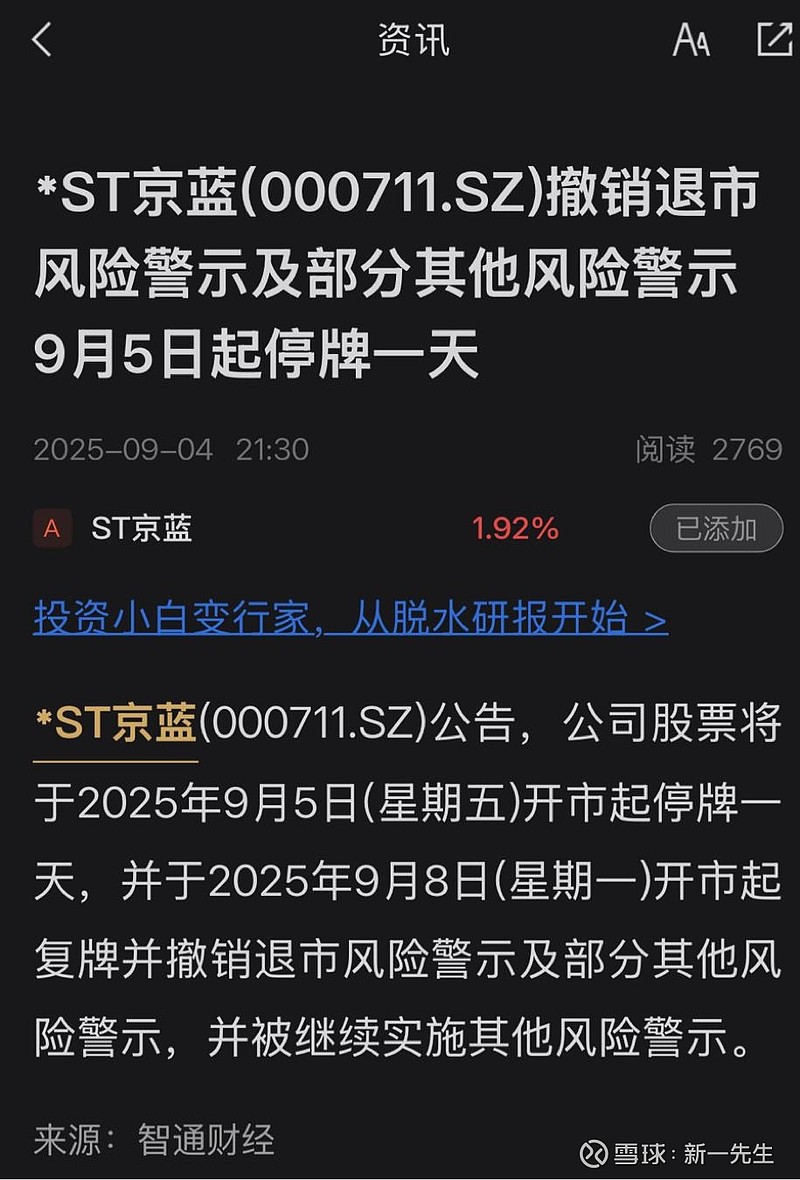 st京蓝已被撤销退市风险警示并于2025月9月8日复牌,这个时候st标识前面没带*号,st标识预计在2026年8月申请摘除,并且重整执行进入尾声,公司正常经营,业务已进行战略转型。