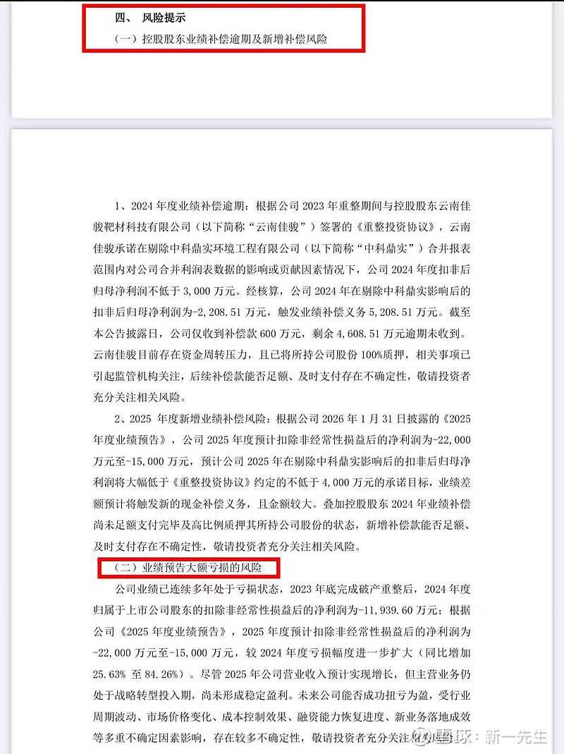 (1)控股股东业绩补偿预期及新增补充风险:这里说的是补偿不到位,意思就是:你这两年外面亏的钱和少赚到的钱,你爸爸承诺补给你,但暂时没钱。