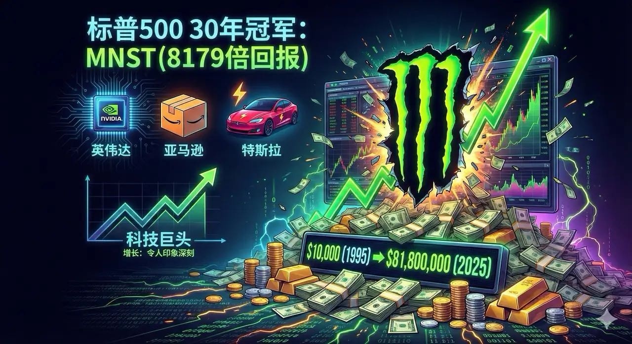 过去30年(1995-2025)标普500中回报率最高的“股王”,绝对让你大跌眼镜。冠军不是任何科技巨头,而是:怪兽饮料 (Monster Beverage, $MNST)。在大家追逐科技浪潮时,它静悄悄地涨了8179倍!总回报率高达817,940%,年化收益率35.0%。这意味着,如果1995年底你投入1万美元并持有至今,现在账户里已经有约8180万美元了。有时候,最疯狂的回报藏在最不起眼的角落。$怪物饮料(MNST)$查看图片