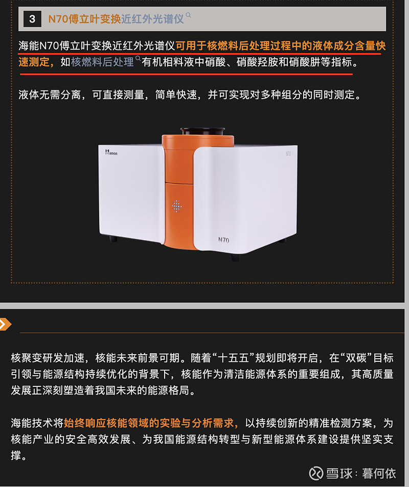 海能N70傅立叶变换近红外光谱仪可用于核燃料后处理过程中的液体成分含量快速测定,如核燃料后处理有机相料液中硝酸、硝酸羟胺和硝酸肼等指标。