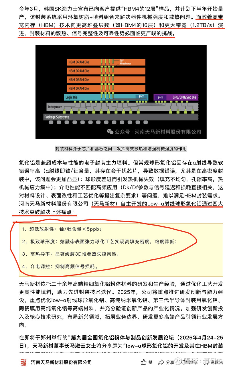 1. 而随着高带宽内存(HBM)技术向更高堆叠层数(如HBM4的16层)和更大带宽(1.2TB/s)演进,封装材料的散热、信号完整性及可靠性势必面临更严峻的挑战。天马新材)自主开发的Low-α射线球形氧化铝通过四大技术突破解决上述痛点: