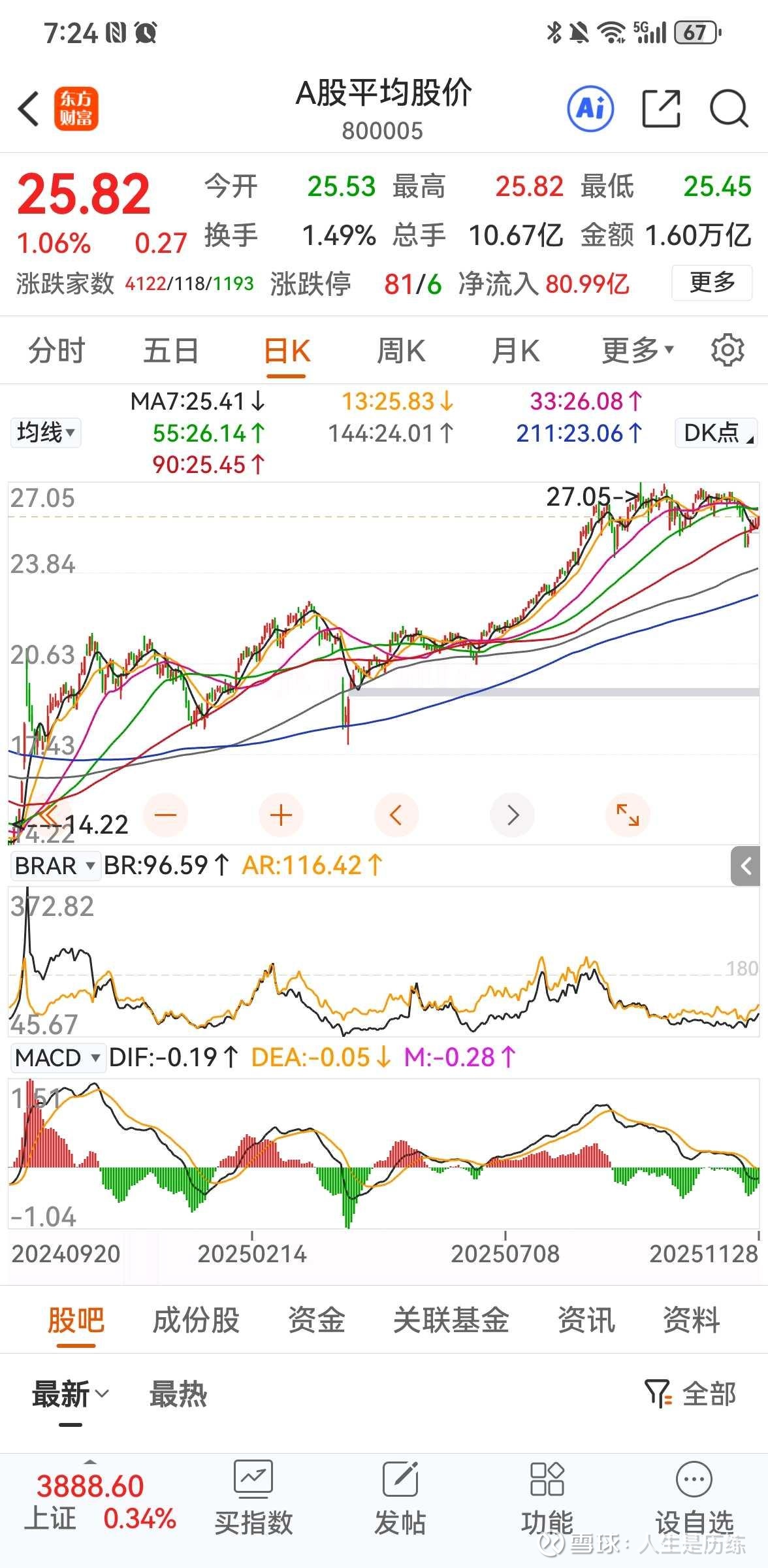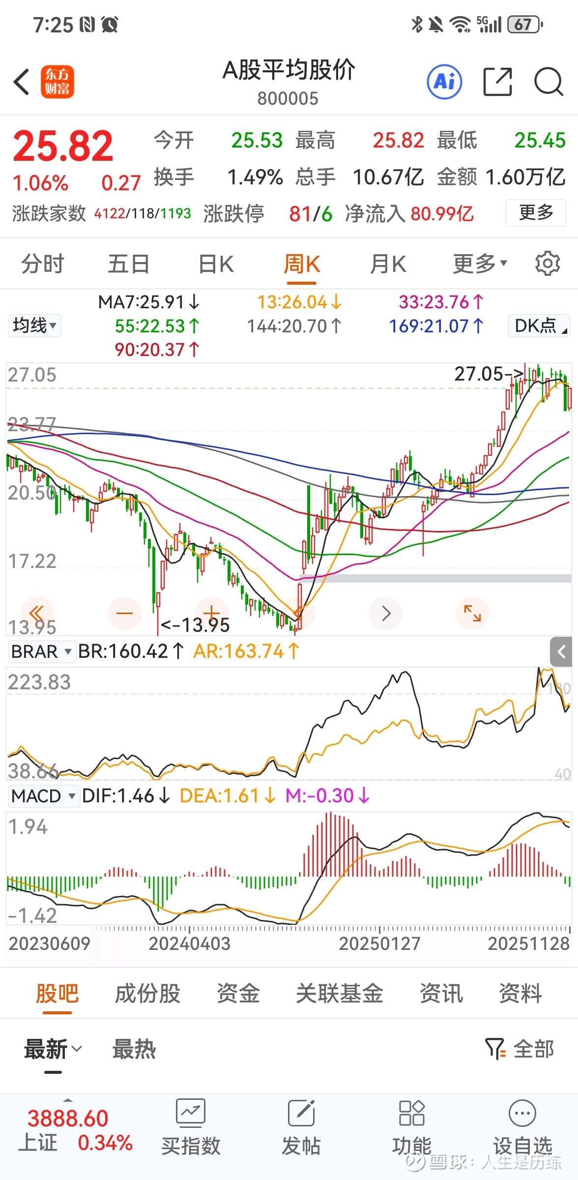 大盘指数从2024年9月以来上涨超过一年了,走势稍好的个股普遍翻倍有余,这从A股平均股价从2024年9月时的13.95元上涨至9月份的27.05元,接近翻倍看出端倪,而平均股价已经在9月份率先见顶回调。