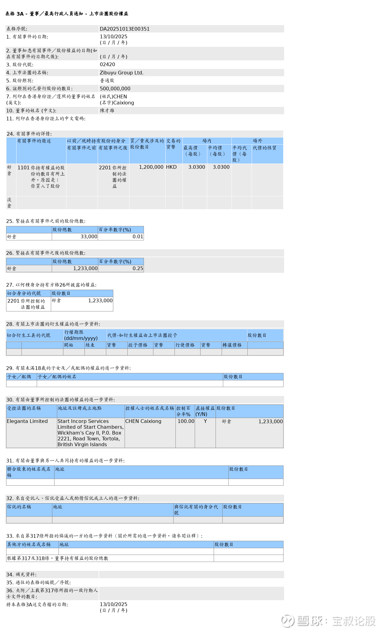10月13日报道,根据香港联交所10月13日披露的文件,陈才雄于10月13日以每股均价3.03港元增持$子不语(02420)$ 120万股普通股股份,价值约363.6万港元。增持后,陈才雄最新持股数目为123.3万股股份,好仓比例由0.01%升至0.25%。