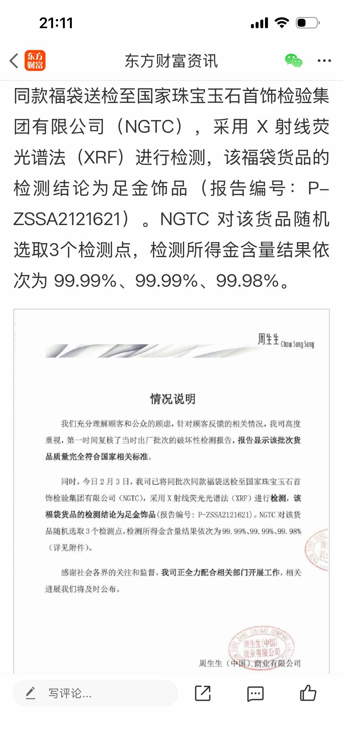 百年企业,信誉比什么都重要,不是靠造假混饭吃的,听到那新闻,我还是比较信周生生的,都是自营店
